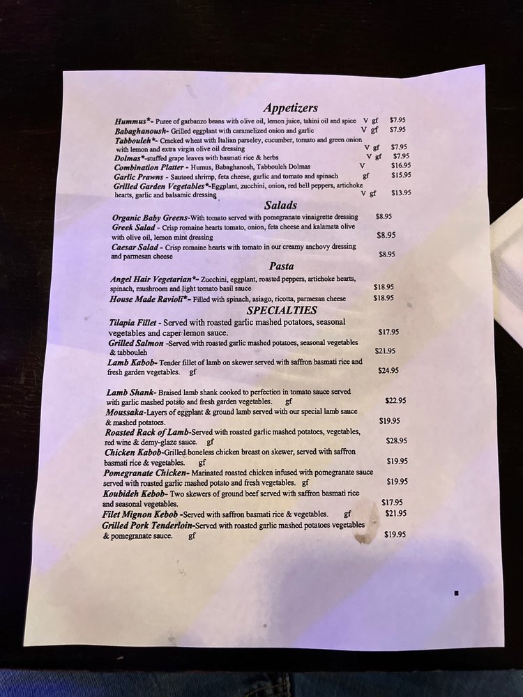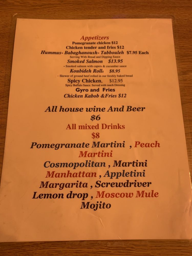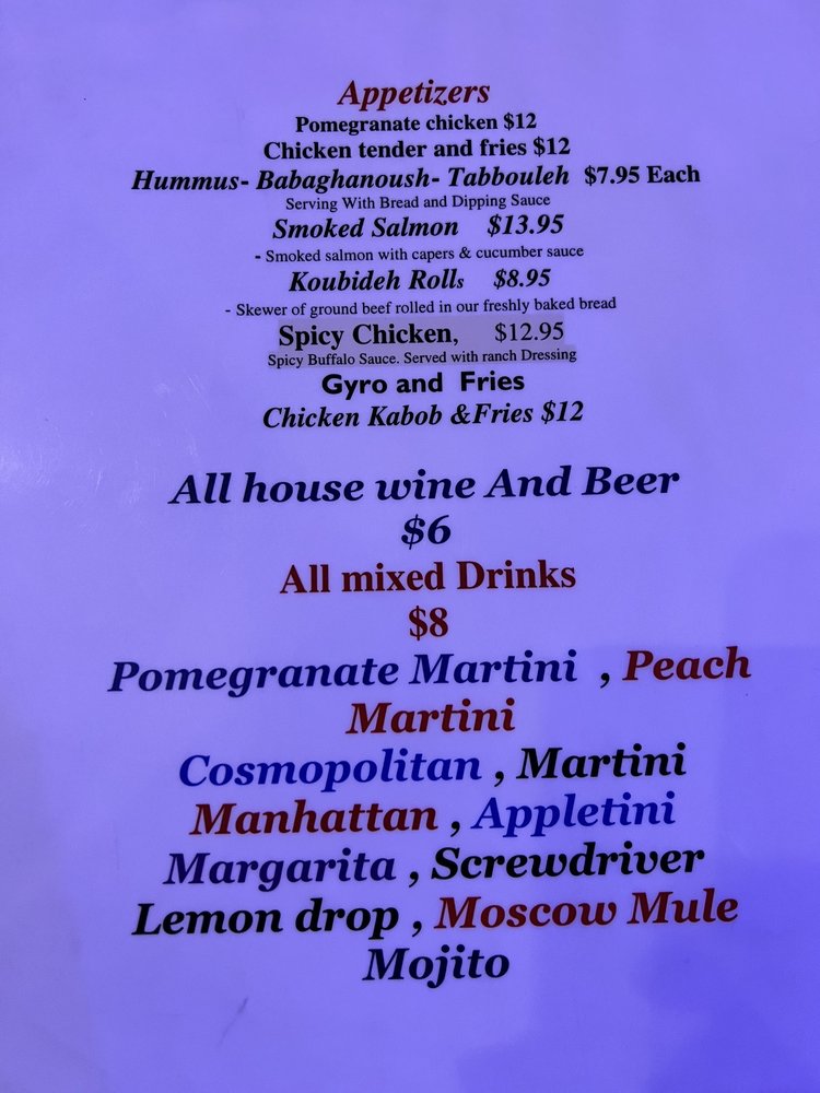 Hummus -Puree of garbanzo beans with olive oil, lemon juice , tahini oil and spiceGreek Salad- Crisp romaine hearts, tomato, onion, feta cheese and kalamata olive with olive oil and lemon mint dressingGrilled Chicken Breast Sandwich -lettuce tomato, onion and balsamic dressing Koubideh Kebob- One skewer of ground beef