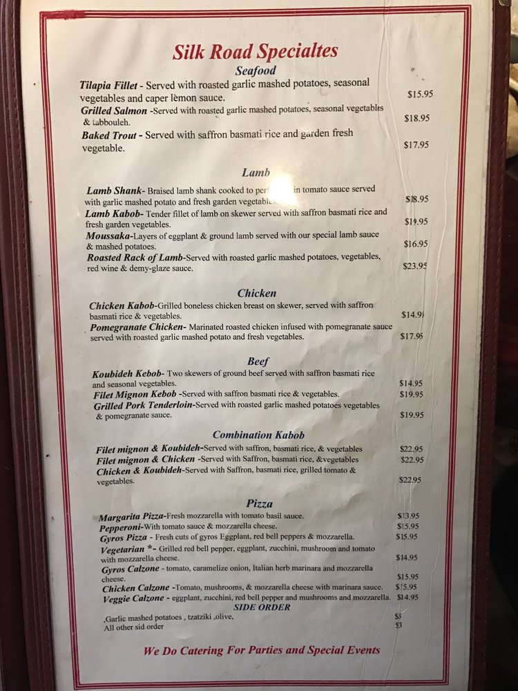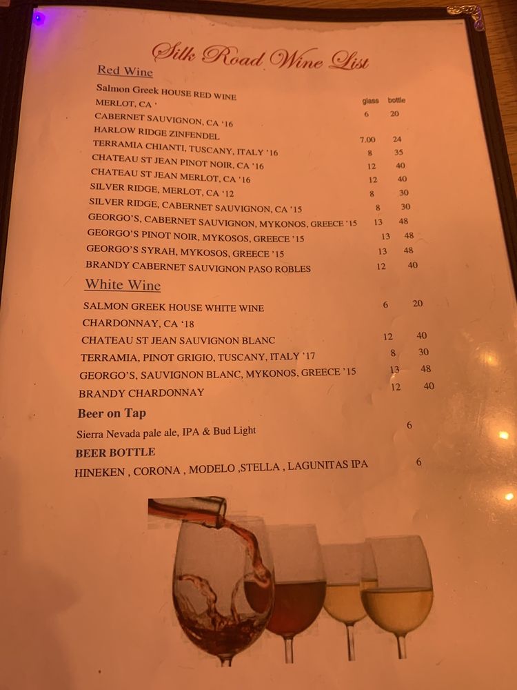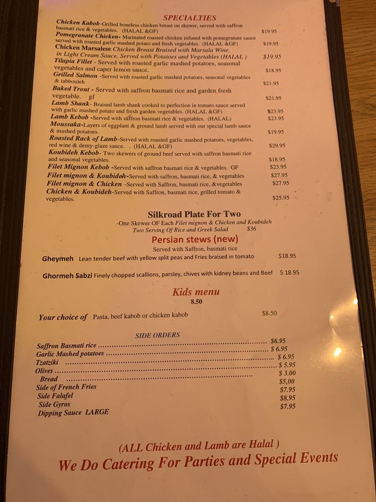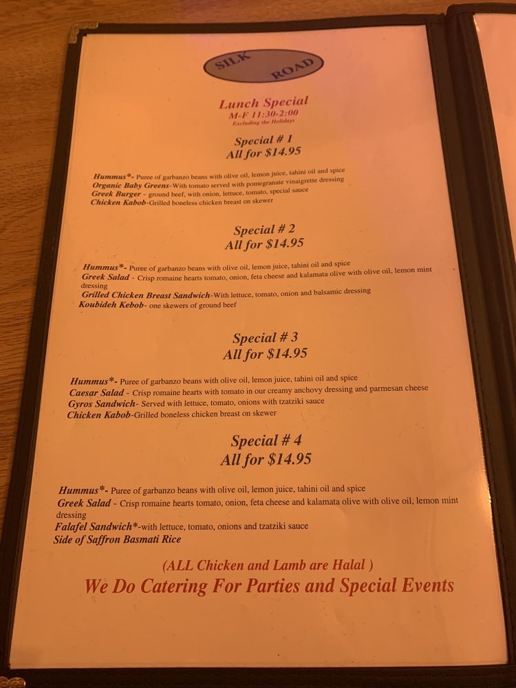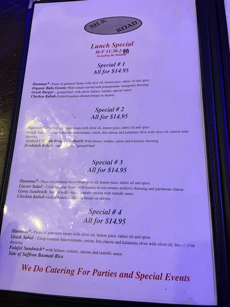Introducing the menu at Silk Road, located in Walnut Creek, CA, this restaurant offers a wide range of Mediterranean dishes with a focus on fresh ingredients and bold flavors. From appetizers like hummus, babaghanoush, and dolmas to salads like Greek and Caesar, the menu provides a variety of choices for every palate. The sandwiches, including the Greek Burger and Grilled Chicken Breast, showcase the restaurant's commitment to quality and taste. Customers rave about the flavorful dishes, attentive service, and cozy outdoor dining area. With an extensive wine selection and a welcoming atmosphere, Silk Road is a must-visit for anyone craving authentic Mediterranean cuisine.