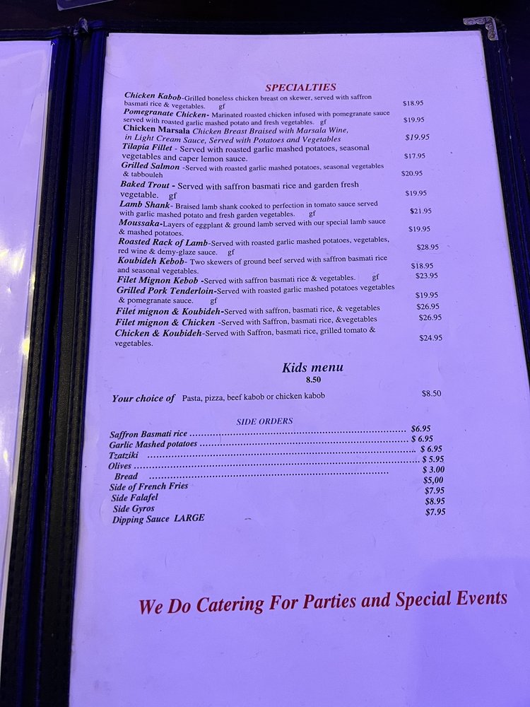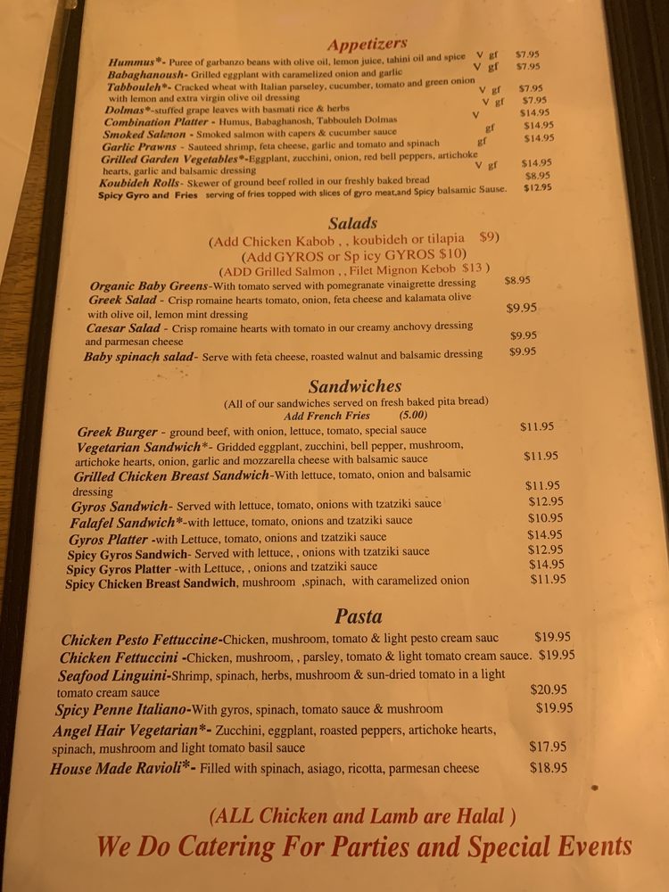 Hummus -Puree of garbanzo beans with olive oil, lemon juice , tahini oil and spiceCeasar Salad -Crisp romaine hearts with tomato with creamy dressing and parmesan cheeseGyros Sandwich- served with lettuce, tomato, onions and tzatziki sauceChicken Kebob- grilled boneless chicken breast on skewer